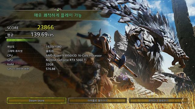 | RTX 5060 Ti | TAA (DLSS 미적용) | 86.15 | 51.35 | 176.37 | DLSS 미적용 시 FHD 기준 평균 80FPS 중반 수준 유지 |