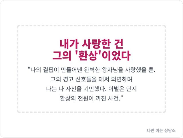 이별의 진짜 이유는, 당신이 덮어두었던 현실과 당신이 꾸며낸 환상 사이의 괴리(Cognitive Dissonance)를 더 이상 견딜 수 없게 되었기 때문이다. 혹은 상대방이 당신의 그 과도한 기대와 투사를 감당하기 버거워 도망쳤기 때문이다. 당신은 그에게 ‘완벽한 왕자님’의 역할을 강요했지만, 그는 그저 평범하고 이기적인 한 명의 인간이었을 뿐이다.