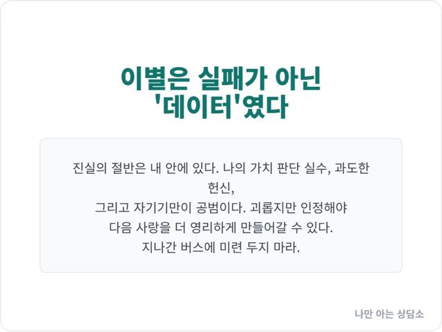 이별은 실패가 아니라 데이터다. 당신은 이번 연애를 통해 ‘나는 어떤 사람에게 쉽게 가치를 내어주는가’, ‘나는 어떤 결핍 때문에 환상을 만들어내는가’에 대한 귀중한 데이터를 얻었다. 이 데이터를 가지고 다음번에는 더 영리하게 거래하고, 더 건강하게 사랑하면 된다.