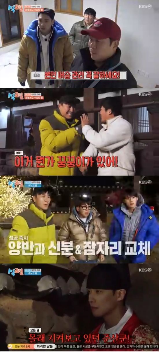 이날 문세윤, 조세호, 이준은 양반으로 잠자리 복불복 없이 실내취침을 하게 됐다.
