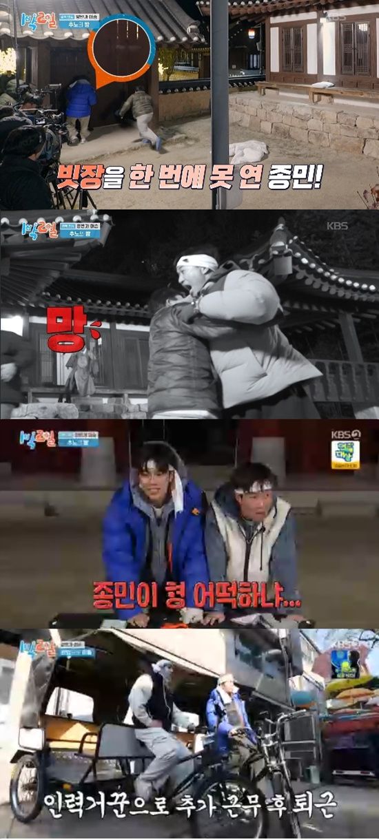 14일 방송된 KBS 2TV '1박 2일 시즌4'에서는 김종민, 문세윤, 조세호, 이준, 딘딘, 유선호가 '추노의 밤'을 보내는 모습이 전파를 탔다.