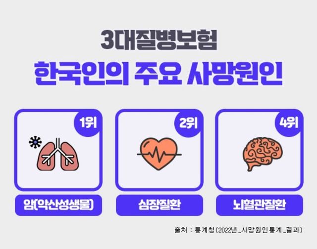 [파이낸셜경제=김예빈 기자] 흔히 3대질병이라 일컫는 암, 심혈관질환, 뇌혈관질환은 통계청 발표자료에 따르면 한국인의 주요 사망원인 중에서 3위 폐렴을 제외하고 1~4위를 차지하고 있으며, 이전부터 지금까지도 살면서 가장 먼저 대비해야 하는 치명적인 질병으로 강조되고 있다. 이러한 중대질병에 대비하기 위하여 상기 세가지 치명적인 질병을 집중보장하는 3대질병진단비보험을 많이 가입하고 있다. 3대진단비보험은 각각의 질병을 중점적으로 보장하면서도 가입자 특성에 맞는 특약을 추가함으로써 종합건강보험으로도 활용할 수가 있다.