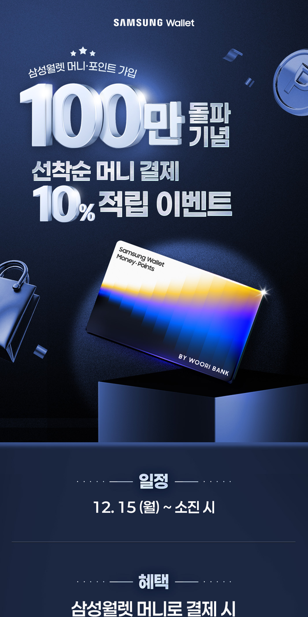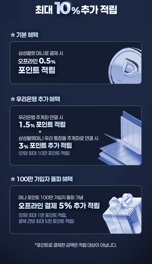 양사는 이번 100만 명 돌파를 기념해 최대 10% 포인트 적립 이벤트를 12월 15일부터 진행한다. 삼성월렛 머니로 오프라인 결제시 △기본 0.5% 적립은 물론, 한도가 소진될 때까지 △100만 돌파 기념 5% △우리은행 계좌 충전·결제시 1.5% △'삼성월렛머니 우리통장' 사용시 3% 혜택이 더해져, 고객은 결제금액의 최대 10% 포인트를 받을 수 있다.