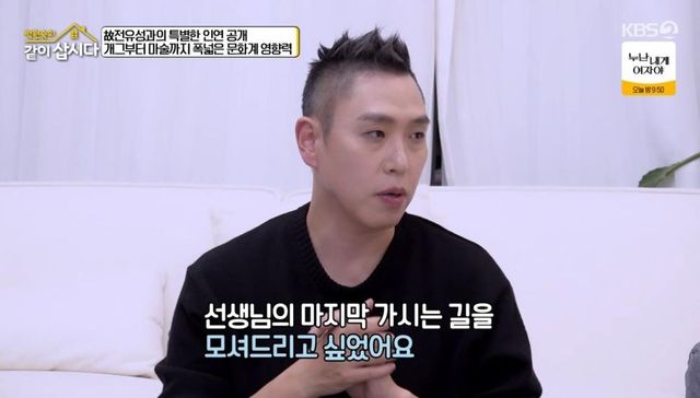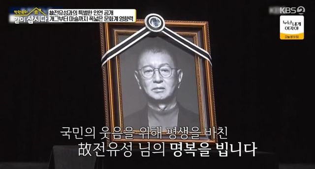 그러면서 “커가면서 봤을 때 (전유성은) 코미디언이라고 정의하기 보다 코미디 상황을 연출하는 문화 연출가 같았다. 피식하게 웃어 넘길 수 있는 상황을 진지하게 연출을 하고 계시더라. 평소에도 질문을 던지셨다. 사람들의 환경을 만들어주는 사람인 것 같았다. ‘나무를 심는 사나이’라는 책을 좋아하는데 그 사나이처럼 척박한 땅에 씨앗을 심어두신 것 같은데 어느 날 보니까 숲이 되고, 물이 흐르고, 사람들이 놀고 있는 거다. 대중이 봤을 때 그냥 코미디언이라고만 생각하면 뭔가 분하다. 문화 예술가, 대중 예술가, 연출가로서 해주신 게 너무 많다. 그래서 마지막 가시는 길을 모시고 싶었다”라고 고백했다.