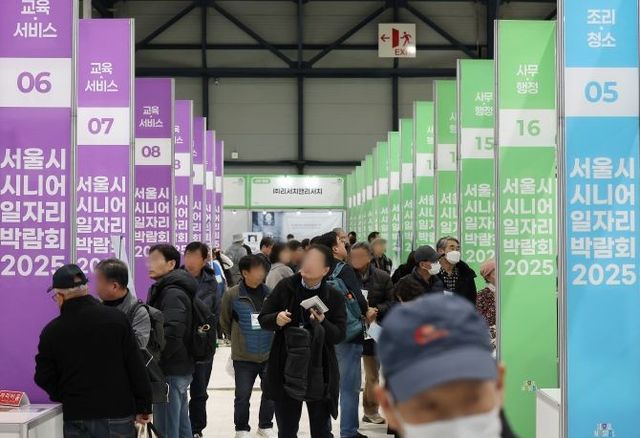 지난달 18일 서울 세텍에서 열린 '서울시 시니어 일자리박람회 2025'를 찾은 구직자들이 채용업체가 마련한 부스를 둘러보고 있다. © 연합뉴스
