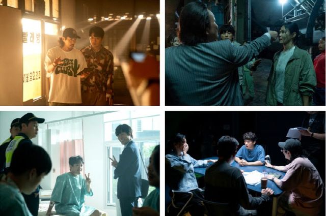 특히 긴박감 넘치는 액션 시퀀스의 비하인드도 엿볼 수 있다. 진중한 표정으로 촬영 장면을 모니터링하는 허성태, 조복래와 긴장감 넘치는 장면의 동작을 맞춰보는 서민주, 차순배의 모습에서 뜨거운 열정이 느껴져 감탄을 자아낸다. 여기에 고된 촬영 중에도 웃음을 잃지 않는 현장 분위기도 포착됐다. 카메라를 향해 장난스럽게 브이를 그려 보이는 허성태와 진선규의 모습과 다 같이 둘러앉아 웃음꽃을 피우며 파이팅 넘치는 에너지를 발산하는 모습은 이들의 끈끈한 케미가 작품의 완벽한 호흡으로 이어졌음을 보여준다.