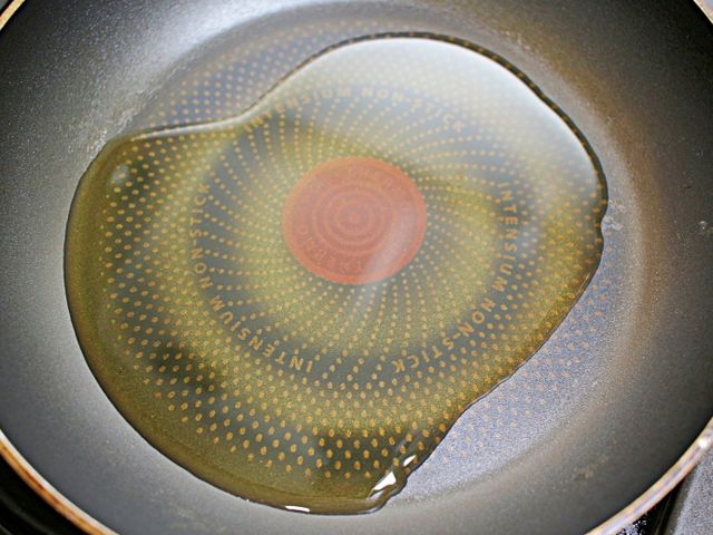 중불로 예열한 팬에 기름을 약간 넉넉하게 둘러주세요.
