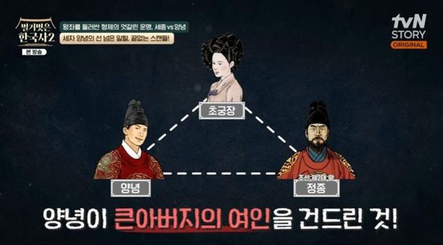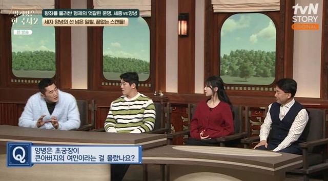 “양녕은 초궁장이 큰아버지의 여인인 걸 몰랐냐”라는 김동현의 질문에 김경수 교수는 “실록에 의하면 상황인 정종이 일찍이 이 기생을 가까이했는데 세자가 이를 알지 못했다고 기록됏다. 세자가 몰랐다는 걸 굳이 기록했다는 것이 어색하다. 태종이 미리 손을 쓴 것으로 추정된다. 이 상황 자체가 도의적으로 상당히 심각한 문제였다”라고 설명했다.