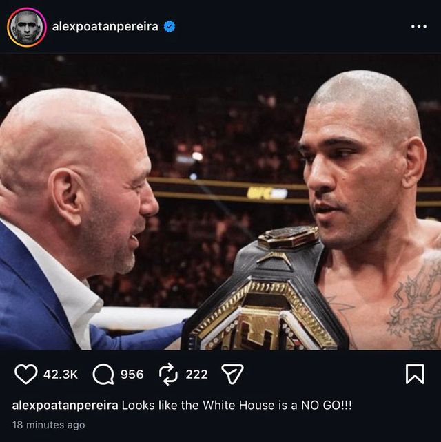 매체에 따르면 UFC 라이트헤비급 챔피언 페레이라는 자신의 인스타그램을 통해 UFC 최고경영자 데이나 화이트와 함께 찍은 사진을 게시하며 "백악관 대회는 못 나가겠네!!!(Looks like the White House is a NO GO!!!)"라고 적었다.