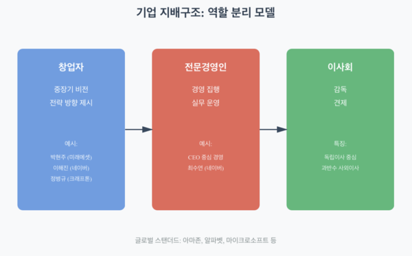 일찍이 글로벌 기업들은 창업자 중심 체제를 벗어나 전문경영인 중심 구조로 전환했다. 경영진과 이사회의 역할 분리를 핵심 원칙으로 삼고 지배구조 투명성을 강화해 왔다.