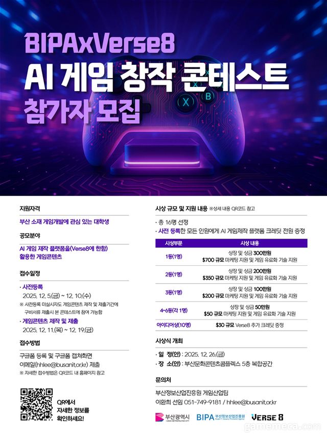 부산광역시와 부산정보산업진흥원(이하 진흥원)은 AI 기반 게임 제작 플랫폼 'Verse8'을 활용해 'BIPA x Verse8 AI 게임 창작 콘테스트'를 추진한다.