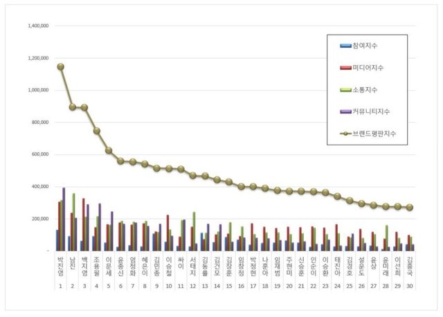 대망의 1위, 박진영 브랜드는 참여지수 13만 1383, 미디어지수 30만 5700, 소통지수 31만 7194, 커뮤니티지수 39만 3658이 되면서 브랜드평판지수 114만 7935로 분석됐다. 지난 11월 브랜드평판지수 99만 9916과 비교해보면 14.80% 상승했다.