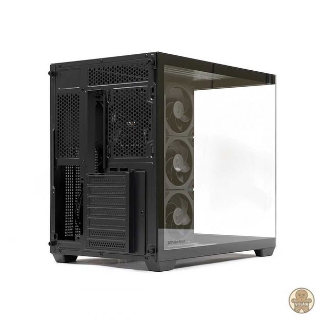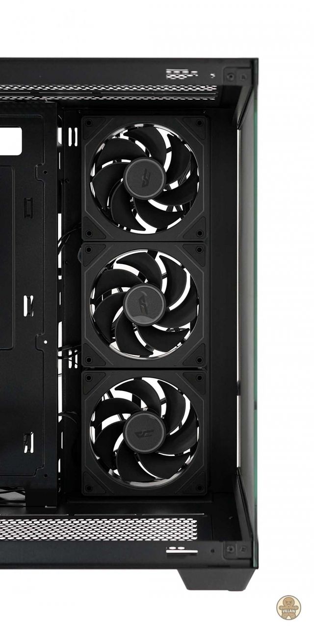 우측 챔버에는 파워 서플라이 장착을 위한 공간이 마련돼 있다. 스토리지 장착을 위한 브래킷도 상단에 배치된다. 메인보드 길이를 넘는 고성능 그래픽카드도 무리 없이 장착할 수 있는 구조가 여기에서 확인되는데, 내부의 흡기용 쿨링팬들이 우측 챔버쪽으로 장착되도록 구조를 효율화했다. 덕분에 반대편에는 길이가 긴 그래픽카드도 원활하게 장착할 수 있는 공간이 확보됐다.