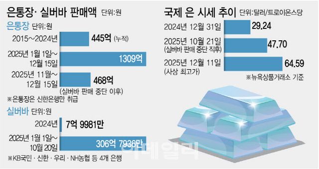 16일 KB국민·신한·우리·NH농협 등 4개 은행의 올 한해 실버바 판매액은 총 306억 7936만원 어치로 집계돼 2024년 판매액(7억 9981만원)보다 38배나 폭증했다. 이런 급격한 수요 증가로 인해 실버바는 극심한 품귀 현상을 빚으며 3월과 10월 판매 중단 사태가 벌어졌고, 10월 20일 이후 물량 소진으로 연말까지 더 이상 살 수 없는 상황이다. 이로 인해 실버바 수요가 고스란히 은 통장으로 몰리고 있다.