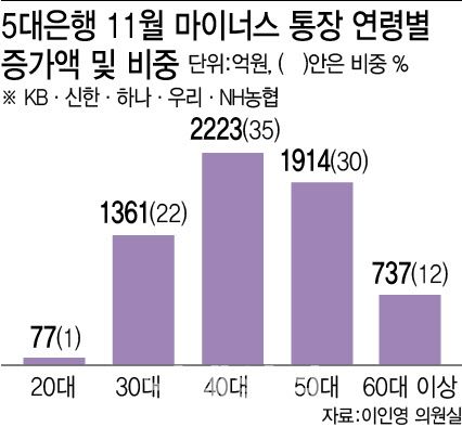 16일 5대 은행(KB국민·신한·하나·우리·NH농협은행)이 이인영 더불어민주당 의원실에 제출한 자료를 이데일리가 입수해 분석한 결과, 지난 11월 마통 잔액 증가액 6311억원 가운데 40대 증가액은 2223억원으로 집계됐다. 전체의 35% 수준으로 전 연령대 중 가장 많다.