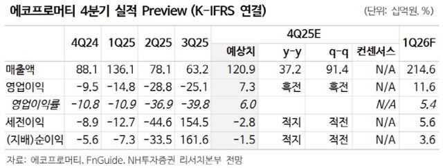 4분기 예상에 대해선 “매출액은 1209억원(+37%), 영업이익 73억원으로 흑자전환을 예상한다. 감가상각 내용연수 변경에 따른 일회성 이익 약 180억원이 반영될 예정”이라며 “일회성 이익을 제외한 영업이익은 -110억원으로 추정한다. 전구체판매는 3Q25(3분기) 선제적 재고조정 이후 고객사 재고 축적으로 +30% q-q(분기대비) 예상한다. 니켈 제련 실적은 연결 반영이 지연되고 있어 지분법 이익(지분 28%)으로 우선 반영될 예정”이라고 덧붙였다.