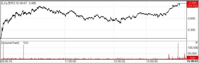 NanoEntek shares surged to the daily upper limit, closing at 3995 won, up 29.92 percent(920 won). It marks the stock’s first approach to the 4000won range in about 11 months following a high of 4140 won on Jan. 9.