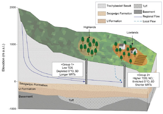 다중 환경추적자 자료를 상호 검증한 결과, 제주삼다수의 원수가 되는 빗물은 한라산 국립공원 내 해발 1450m 이상의 고지대에서 함양되며, 평균 체류시간은 약 31년으로 산정됐다. 이는 한라산에 내린 빗물이 장기간 지하를 통과하는 과정을 거쳐 취수원에 도달한다는 점을 과학적으로 확인한 결과다.