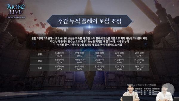 주간 보상 구조 역시 조정된다. 탐험·정복·초월 콘텐츠에서 오드 에너지 보상을 획득할 경우, 주간 누적 플레이 횟수를 기준으로 키나 획득량에 제한이 적용된다. 해당 제한은 서버 단위로 누적되며, 일정 횟수를 초과할수록 감소 폭이 점진적으로 커지는 방식이다. 개발진은 주간 플레이에 따른 보상 격차를 완화하기 위한 조치라고 설명했다.