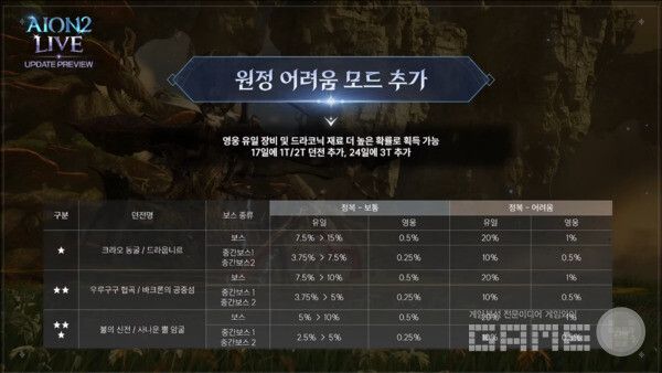 17일부터는 원정 ‘어려움’ 난이도가 순차적으로 추가된다. 1·2티어 던전이 먼저 적용되고, 24일에는 3티어가 열린다. 개발진은 정복 난이도 상향과 어려움 난이도 추가가 맞물리며 아이템 획득 체감이 개선될 것이라고 설명했다.