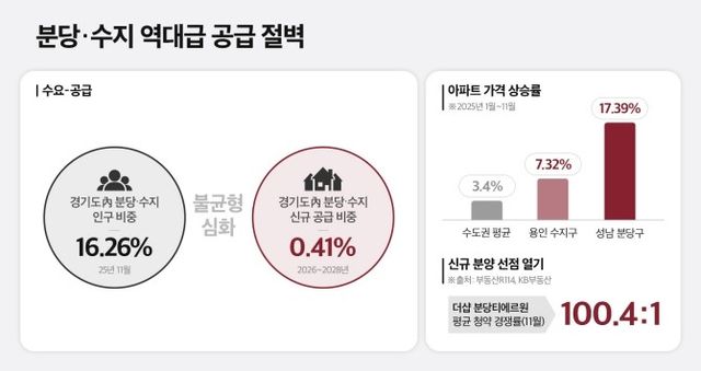 현재(11월 기준) 분당과 수지 인구가 경기 인구 16.26%를 차지하는 핵심 주거지임에도 불구하고, 신규 주택 공급은 사실상 '제로(0)'에 가까운 셈이다. 단순 계산으로도 인구 비중(16.26%)대비 공급 비중(0.41%) 격차가 심해진 만큼 이들 지역 집값을 끌어올리는 원인으로 작용하고 있다.