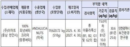 식품의약품안전처(처장 오유경)는 수입식품등 수입·판매업체인 ‘(주)이마트(충남 천안시 소재)’가 수입해 판매한 미국산 ‘100% 피넛버터 크리미(식품유형 : 땅콩버터)’에서 아플라톡신이 기준치보다 초과 검출되어 해당 제품을 판매 중단하고 회수 조치한다고 밝혔다.