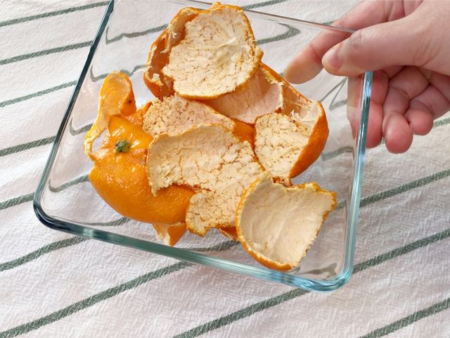 그릇에 물과 귤껍질을 담아 전자레인지에서 5분 정도 돌려보세요.