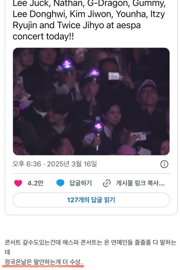 이 장면은 수많은 연예인들이 한자리에 모인 에스파의 콘서트 당일 촬영된 것으로 확인되었으며, 팬들은 “그동안 뉴진스, 르세라핌, 아일릿 등 하이브 소속 걸그룹 콘서트엔 한 번도 간 적 없던 정국이 왜 유독 에스파 공연에 나타났는가”라는 의문을 제기했다.