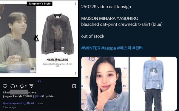 정국이 8월 17일에 입고 윈터가 7월 29일에 입은 옷은 '메종미라아랴스히로'브랜드이다.