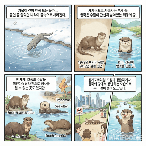 하천 오염과 개발로 한동안 거의 사라진 존재로 여겨졌으나, 일부 강과 습지에서는 다시 모습을 드러내고 있다. 세계적으로는 개체 수 감소와 서식지 축소가 동시에 진행됐다. 그런 흐름 속에서 한국은 수달이 간신히 남아 있는 지역으로 언급된다. 해외와 다른 이 상황이 수달이라는 생물을 다시 살피게 만든다.