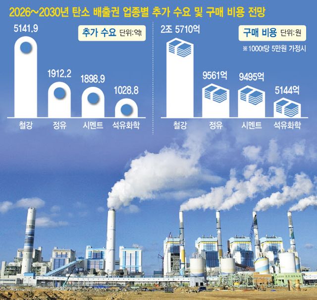 산업계는 정부가 제시한 4차 배출권거래제 할당 계획을 현실적으로 재조정해야 한다고 입을 모은다. 철강·석유·화학·시멘트 등 주요 업종별 협회가 주요 기업을 대상으로 4차 계획기간 동안의 배출권 추가 구매 부담을 조사한 결과 △철강 5141억9000t △정유 1912억2000톤 △시멘트 1898억9000t △석유화학 1028억8000t에 이를 것으로 조사됐다. 이를 배출권 가격을 5만원으로 가정해 계산하면 4차 계획기간 동안 총 배출권 구매비용이 약 5조원에 달하는 것으로 나타났다.