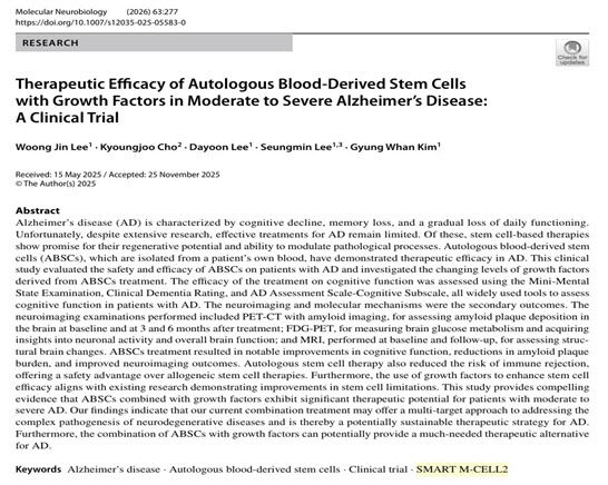 ‘중등도에서 중증 알츠하이머병에서 성장인자를 가진 자가 혈액 유래 줄기세포의 치료 효능(Therapeutic Efficacy of Autologous Blood-Derived Stem Cells with Growth Factors in Moderate to Severe Alzheimer‘s Disease: A Clinical Trial)’ 해당 논문에 따르면 인지 기능 평가는 기저 시점 대비 치료 3개월 및 6개월 후에 걸쳐 MMSE, CDR-SOB, ADAS-Cog 지표를 사용해 진행됐으며, 모든 평가는 군 배정을 알지 못하는 전문 임상가가 수행했다.