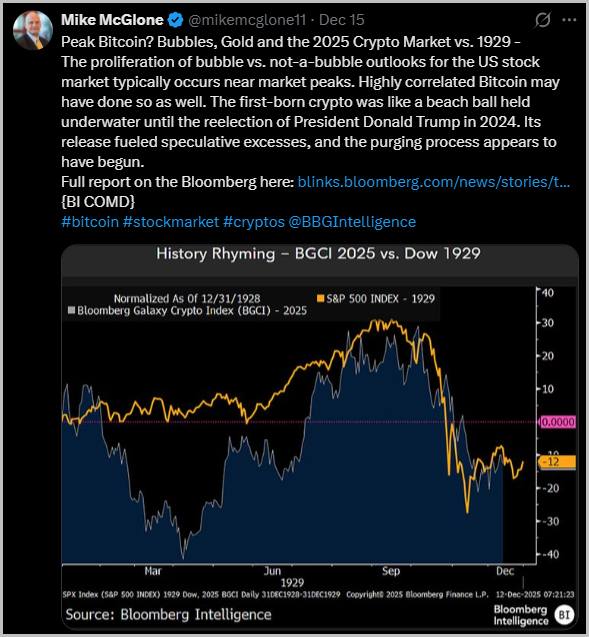 블룸버그 수석 상품 전략가인 마이크 맥글론(Mike McGlone)도 비트코인 붕괴론에 힘을 보탰다. 시카고상품거래소(CBOT) 등에서 25년 이상 시장 경험을 보유한 그는 비트코인 가격 흐름이 1929년 대공황 직전 뉴욕 증시 움직임과 유사하다는 경고를 내놨다. 맥글론은 지난 15일 자신의 소셜미디어(SNS) X(엑스)에 "약 100년의 시간차가 있음에도 불구하고 현재 비트코인의 차트가 1920년대 다우지수가 9년만에 약 10배 급등하며 거품을 형성했던 상황과 매우 닮아있다"며 "비트코인이 최대 1만달러(원화 약 1500만원) 수준까지 급락할 수 있다"고 적었다.