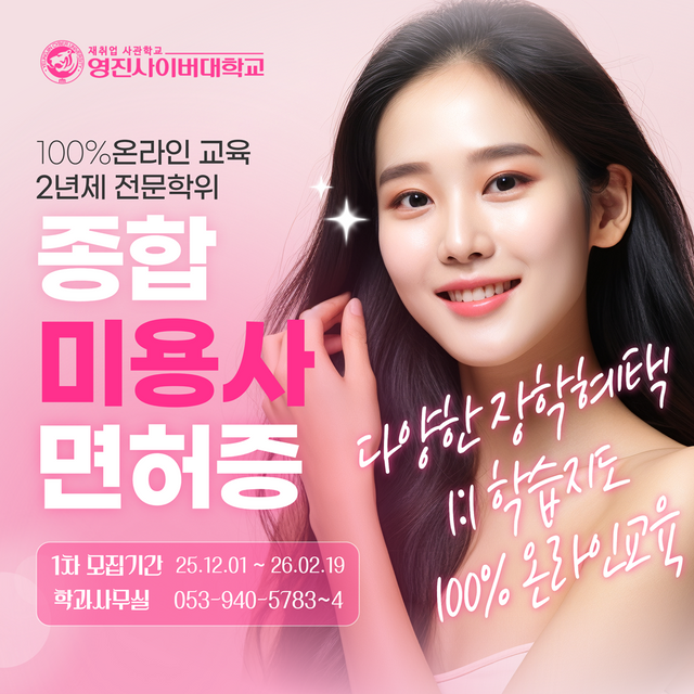 영진사이버대학교가 2026학년도 1·2차 뷰티케어계열 신입생을 모집한다고 19일 밝혔다. 해당 과정은 미용사 종합면허 취득 및 토탈뷰티 전문 교육을 목표로 하며, 전 교육과정을 100% 온라인으로 운영한다고 학교 측은 설명했다.