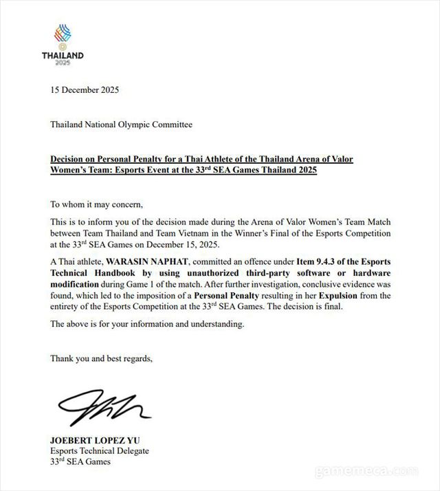 ▲ 나팟 와라신 부정행위에 대한 태국e스포츠연맹의 공식 성명문 (자료출처: 태국e스포츠연맹 공식 페이스북)