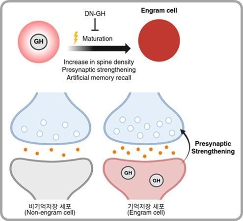 또 연구진은 학습 초기단계에서 만들어지는 단백질 가운데 성장호르몬이 학습 직후 해마에서 빠르게 증가하는 것과 특히 성장호르몬이 학습 시 활성화된 신경세포에 특이적으로 나타난다는 사실을 밝혀냈다.