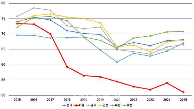이 구조는 지역 간 격차를 더욱 확대시킨다. 경기, 인천, 부산, 대전 등 일부 지역에서는 전세가율이 다시 70% 안팎까지 회복됐지만, 이것이 장기적인 매매가격 상승으로 이어진 사례는 많지 않다. 전세 수요는 존재하지만, 그 지역에 장기간 거주하며 자산을 보유하려는 실거주 수요가 충분하지 않기 때문이다. 전세가율이 높다는 사실은 오히려 매매 수요의 부재를 반영하는 지표일 수 있다.