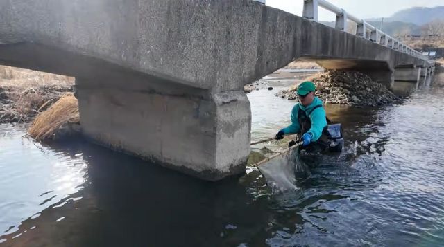 다리 밑 하천에서 족대로 물고기 떼를 잡는 유튜버 '채니아빠'. / 유튜브 '채니아빠'