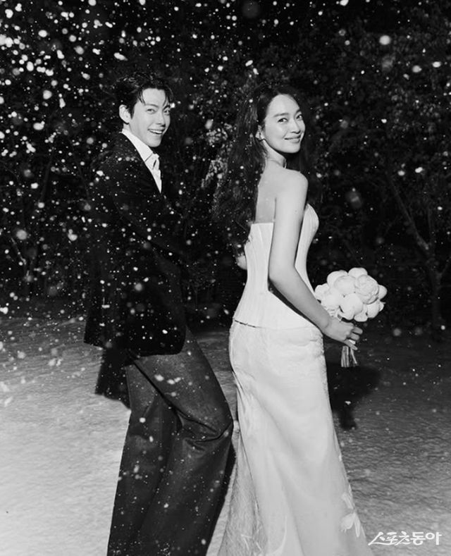 공개된 사진 속에서 웨딩드레스를 입은 신민아와 턱시도를 입은 김우빈이 카메라를 향해 행복한 웃음을 짓고 있다. 특히 흑백 사진 배경으로 눈발이 휘날리는 배경이 연출되며 한 편의 영화같은 분위기를 자아내 눈길을 끈다.