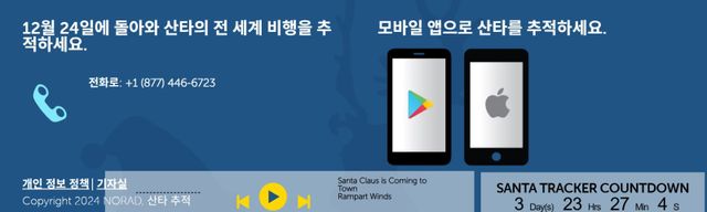 기존에는 미국 번호로 전화를 걸어 산타 위치를 물었지만, 올해는 NORAD 공식 웹사이트(noradsanta.org)를 통해 북미 이외의 지역에서도 쉽게 음성 안내를 들을 수 있는 기능이 추가된다. NORAD 본부는 “산타의 동선은 산타만 알고 있기 때문에 여러분의 집에 언제 어디로 도착할지는 예측할 수 없다”고 했다. NORAD에 따르면 산타는 지난해 12월 24일 오후 11시 24분경 한국에 진입했고 한국 어린이들에게 선물 약 2000만 개를 배달했다.