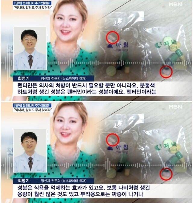 박나래의 전 매니저는 '주사이모' 이 씨에게 받았다는 약에 대해 "아침 약, 점심 전 약, 점심 후 약, 저녁 약, 취침 전 약, 취침 약 등 엄청 많았다. 내성이 생기니까 (박나래가) 어떨 때는 취침 전 약을 두 개씩 먹었다"고 밝혔다.