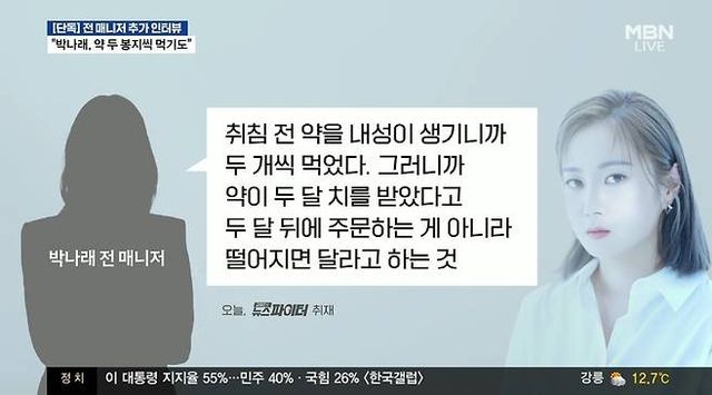 19일 방송된 MBN '김명준의 뉴스파이터'에서는 방송인 박나래와 유튜버 입짧은햇님이 '주사이모' 이 씨를 통해 불법 의료 행위를 했다는 논란과 관련, 전 매니저의 추가 폭로가 이어졌다.