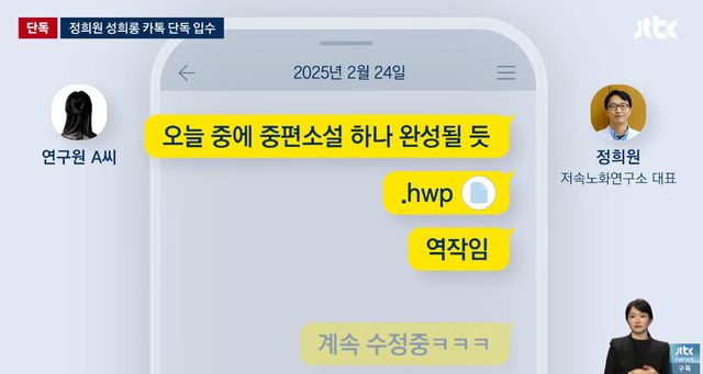 정희원 씨가 연구원 A씨에게 보낸 걸로 알려진 카톡 / 유튜브 'JTBC News'
