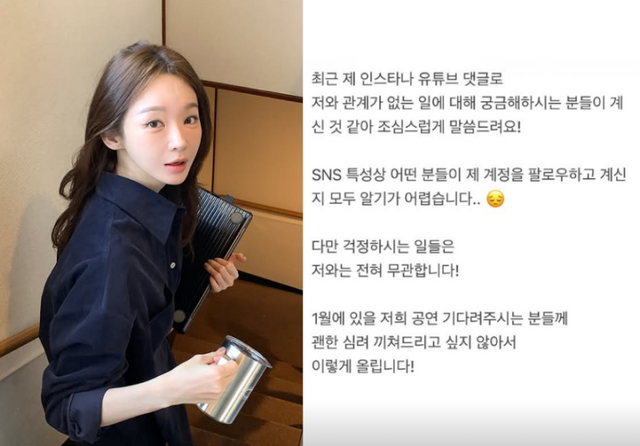 이어 그는 “SNS 특성상 어떤 분들이 제 계정을 팔로우하고 계신지 모두 알기가 어렵습니다”라며 “다만 걱정하시는 일들은 저와는 전혀 무관합니다”라고 밝혔다. 이어 “1월에 있을 저희 공연 기다려주시는 분들께 괜한 심려 끼쳐드리고 싶지 않아서 이렇게 올립니다”라고 덧붙였다.