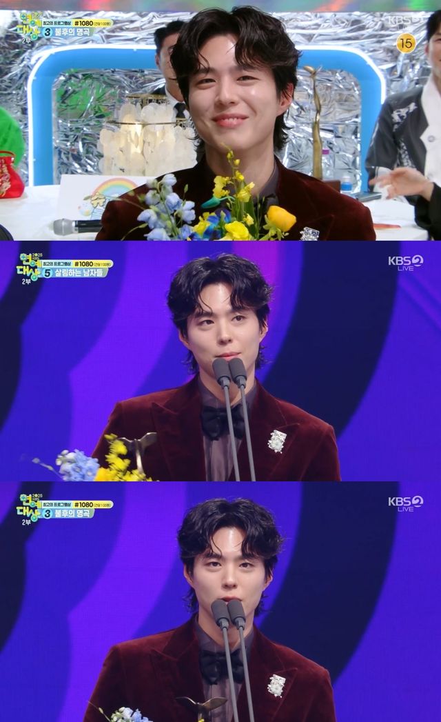 올해의 예능인상 트로피를 안은 박보검은 "10년 전 '뮤직뱅크' 덕에 신인상을 받고, 10년이 지나 이 자리에 다시 올 수 있도록 아낌없는 사랑과 응원을 주신 시청자분들께 진심으로 감사드린다"며 KBS 음악 프로그램과의 깊은 인연을 드러냈다.