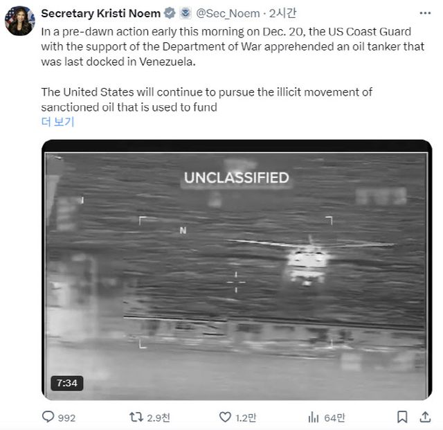 크리스티 놈 미 국토안보부 장관은 20일(현지시간) 엑스(X·구 트위터)를 통해 “오늘 동트기 전 이른 아침, 미 해안경비대가 전쟁부(국방부)의 지원을 받아 베네수엘라에 마지막으로 정박한 유조선을 나포했다”고 밝혔다. 이어 “미국은 이 지역에서 마약 테러리즘을 지원하는 제재 위반 원유의 불법 이동을 계속 추적·차단할 것”이라며 “우리는 끝내 찾아내고, 멈출 것”이라고 경고했다.