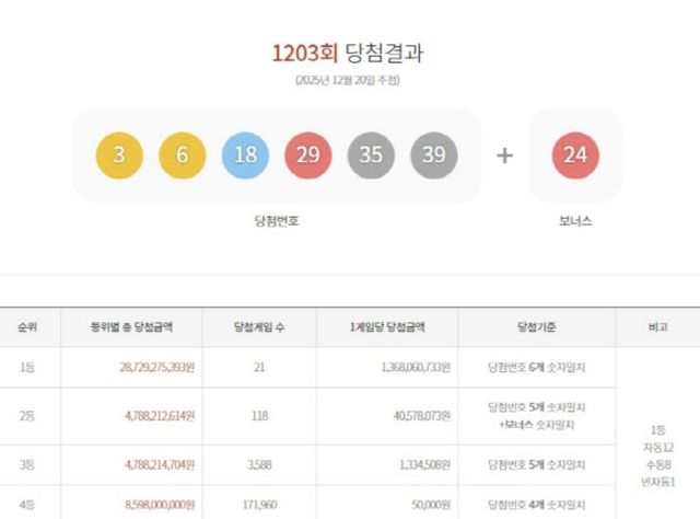 지난 20일 동행복권이 발표한 1203회 로또 당첨번호는 3, 6, 18, 29, 35, 39로 결정됐다. 2등 보너스 번호는 24다.