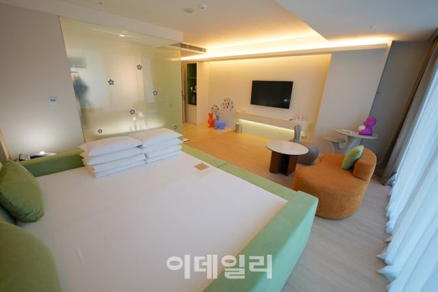 가족 고객을 위한 세심한 서비스도 눈에 띈다. 해당 객실 투숙객은 아기 욕조 등 유아용품을 무료로 대여할 수 있다. 객실이 위치한 컨벤션타워 8층에는 아이들이 자유롭게 이용할 수 있는 놀이 공간 ‘키즈 그라운드’와 작은 도서관 ‘키즈 갤러리’도 마련돼 있다. 숙소 안팎에서 아이 중심의 동선이 자연스럽게 이어지도록 구성했다.