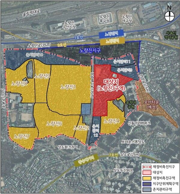 노량진동 232-19번지 일대 노량진3구역은 관리처분계획인가를 앞두고 있는 구역으로, 이주 및 해체공사와 함께 금번 재정비촉진계획 변경에 따른 사업시행계획 변경을 병행 추진해 2027년 착공을 목표로 하고 있다.