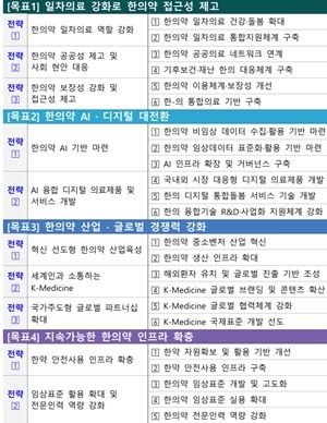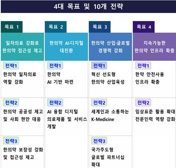 제5차 종합계획은 ‘AI·한의약 혁신을 통한 국민건강 증진과 한의약 산업 경쟁력 강화’를 비전으로 설정하고, 4대 목표와 10개 전략, 23개 추진과제를 제시했다.